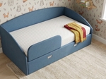 Приятная синяя обивка отлично вписалась в интерьер с «лесными» обоями. Выбрали из всех вариантов из-за возможности выбора бортика. Наличие в вобщем то взрослой модели защитного бортика - для нас это был критически важный момент. Позже можно будет снять. Очень удобно, что внизу есть выдвижные ящики. Так что в целом моделью довольны. Отдельное спасибо менеджерам за помощь при выборе.